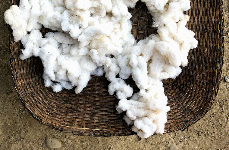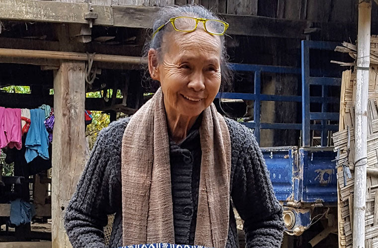 Women from the Tai Lue ethnic minority group in the north of Laos are expert weavers and natural dyers.  They grow their own indigenous cotton and indigo, which they hand weave in the complex tapestry technique for their traditional shawls.  We purchase indigo cotton shawls directly from Tai Lue weavers in Laos, repurposing them into bags and small accessories.  We often pair their handwoven cotton with handwoven Hmong hemp, highlighting the beauty of these two natural fibers.